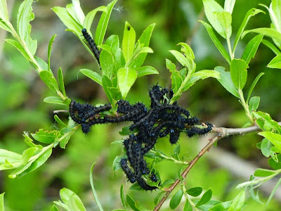 湿地帯に生えた柳(種名不詳)の枝葉にヒオドシチョウNymphalis xanthomelas japonica)の幼虫が大発生していました。
