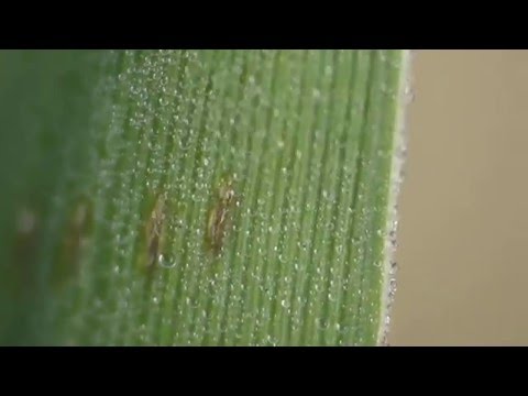 2日前に産卵したヨシの葉を探してマクロレンズで接写してみると、粒状の点列が並んでいました。