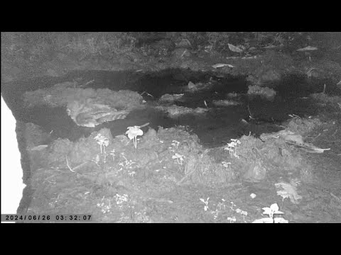 山林に少し開けた湿地帯があり、湧き水が滲み出した浅い水溜りを野生動物や野鳥が水場として利用するので、自動撮影カメラ(旧機種)を設置しています。