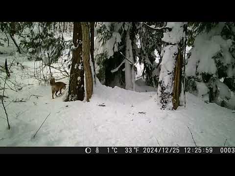 雪山のスギ林をうろついて獲物を探すホンドギツネ【トレイルカメラ:暗視映像】