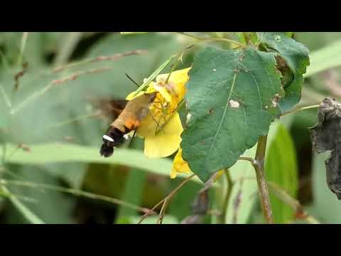 キツリフネの花で吸蜜ホバリングするヒメクロホウジャク(蛾)